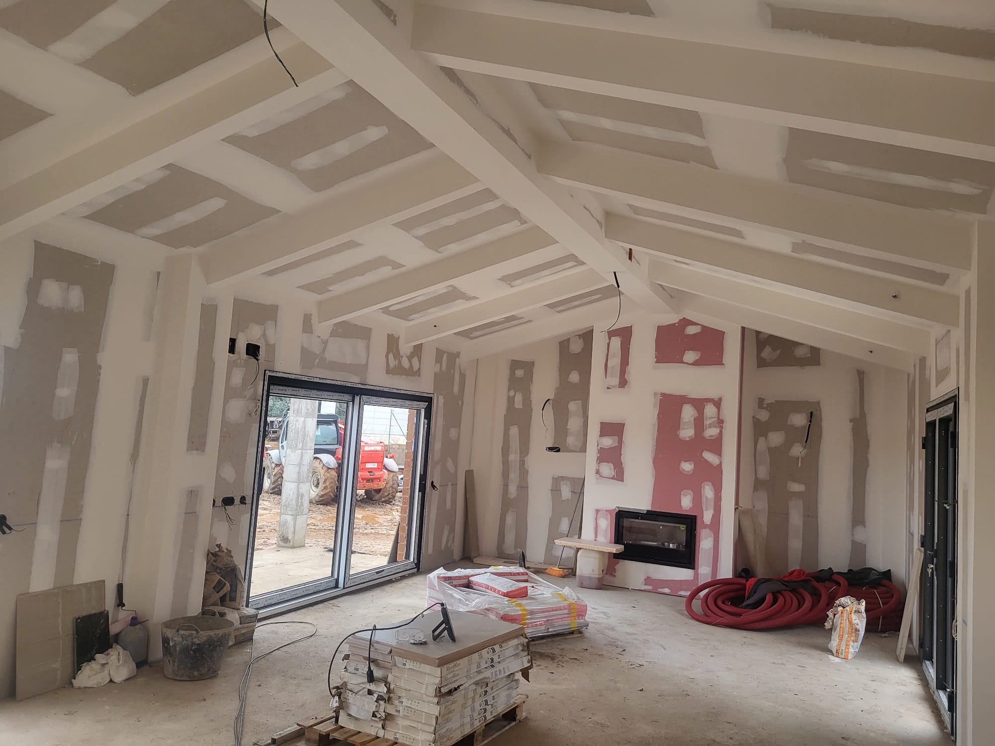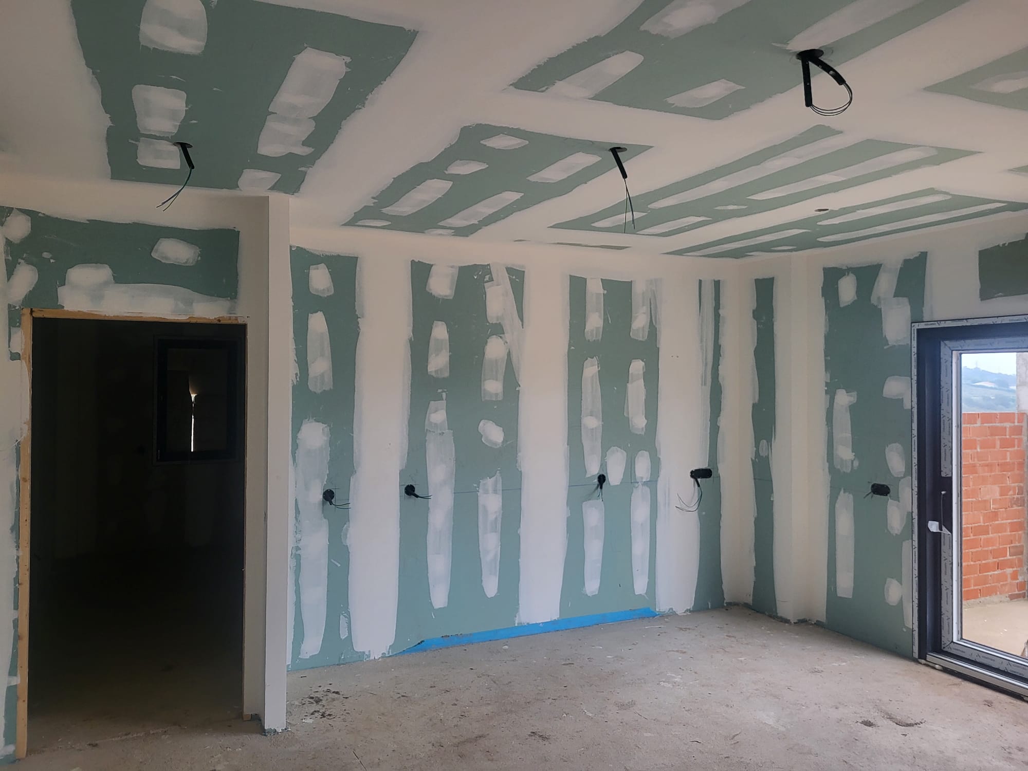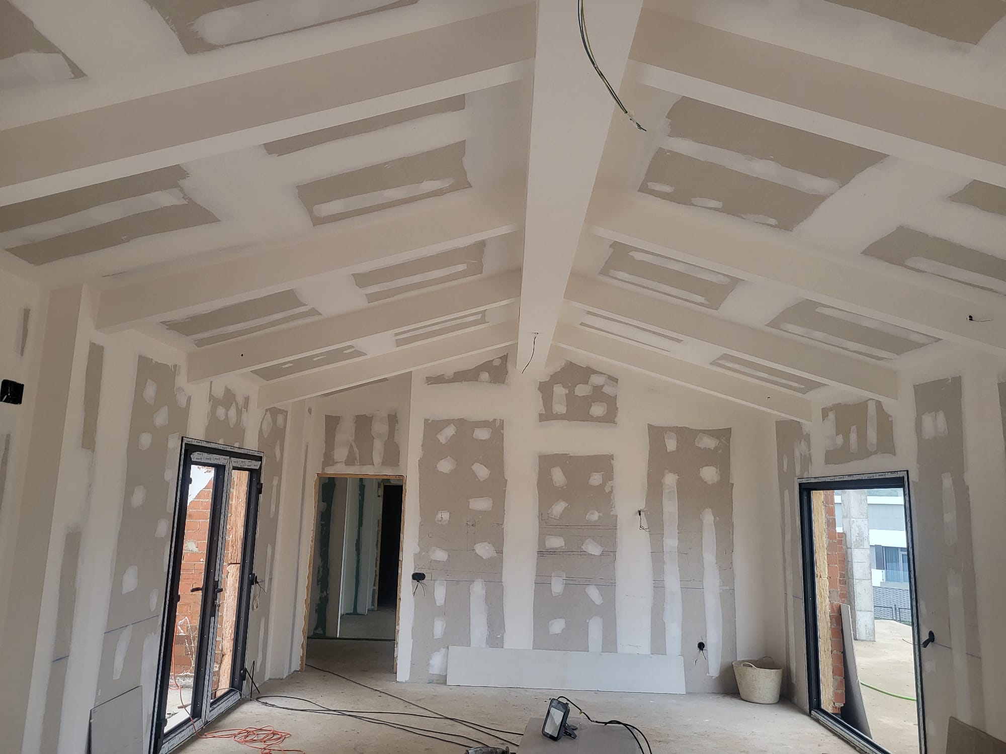 En este chalet de Cáceres hemos realizado toda la obra de tabiques, trasdosados y techos en pladur (placas de yeso laminado).